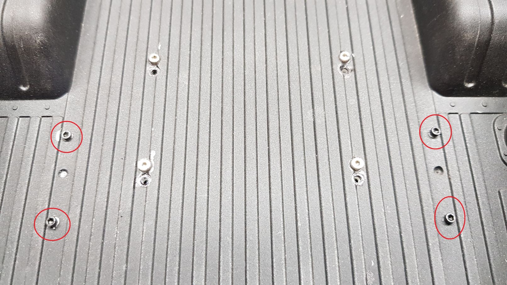 Here's an image of the bed showing the screws used to attach the skid plate. I must say, it was not straight forward to screw these in. One hole did not align and had to "assist drill" the start of a new one for the screw to go in. I did pre-thread the screws into place before attempting to mount it, however it was not as easy as it should have been. Maybe this was because of the wires getting in the way, not sure. It could be others have had no problem at all. Just be aware when installing yours with all the wires in place.