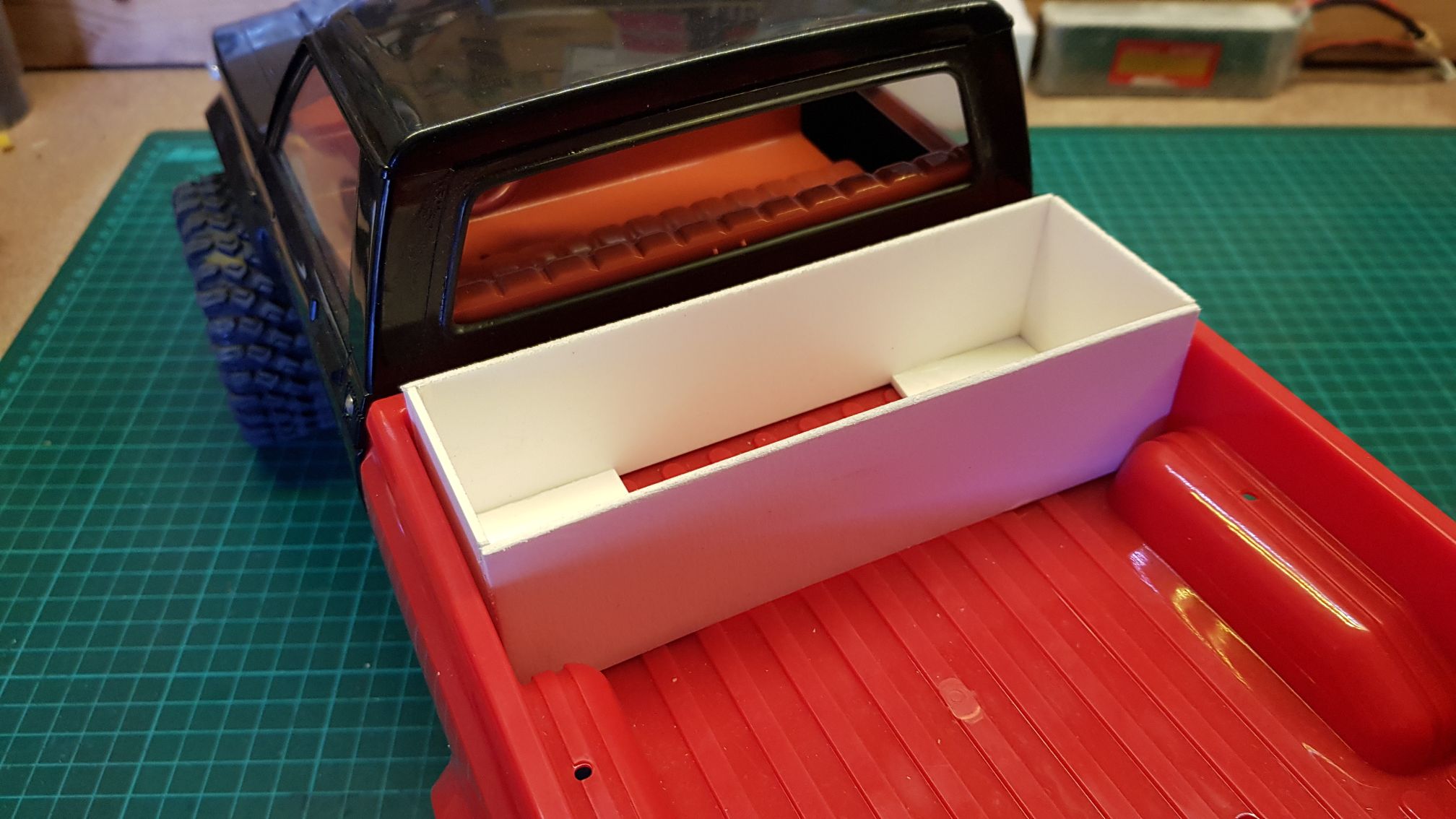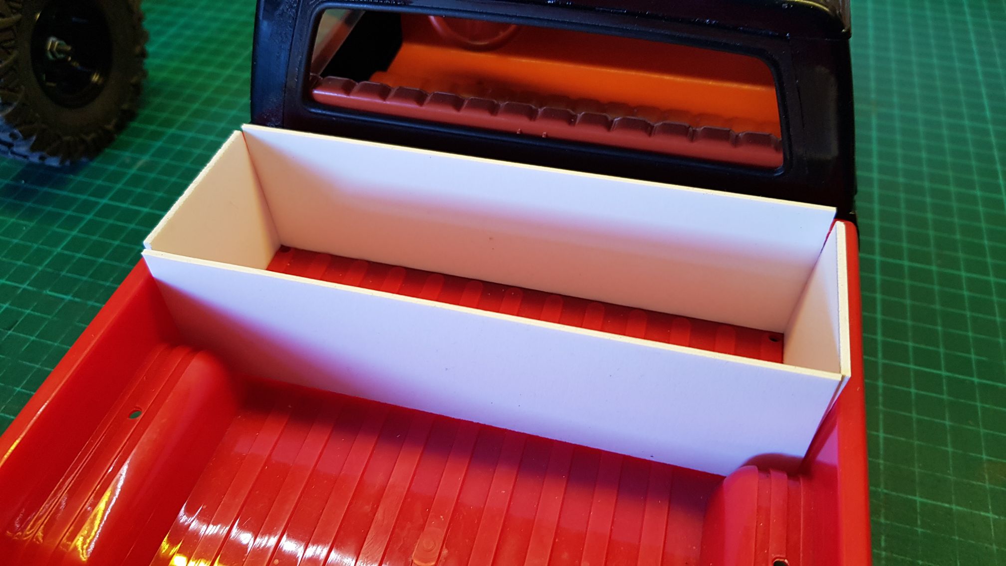 After measuring the available space (including height) in the back of the Hilux, I cut up some styrene and put in in place to see what the result would look like.
