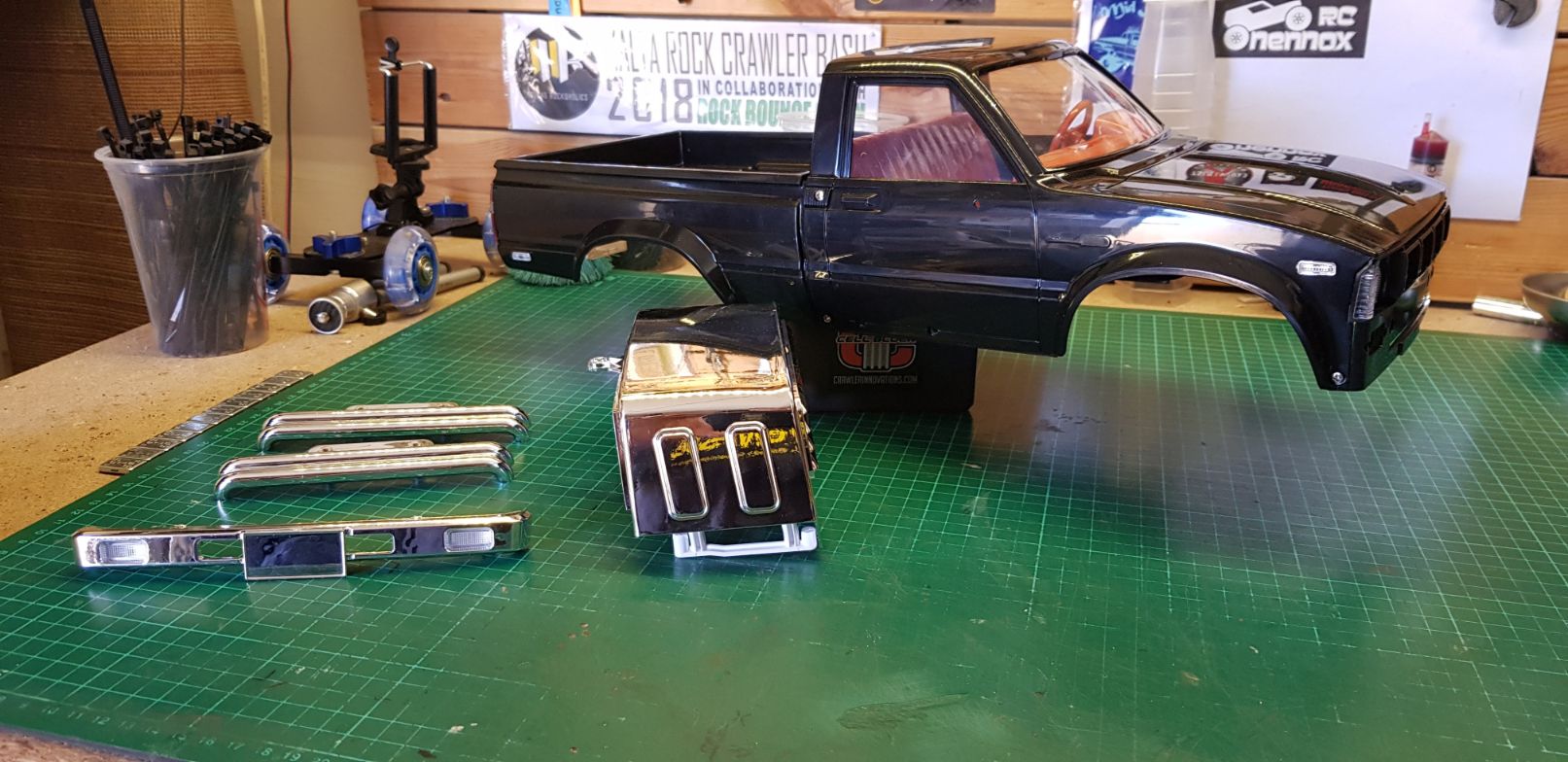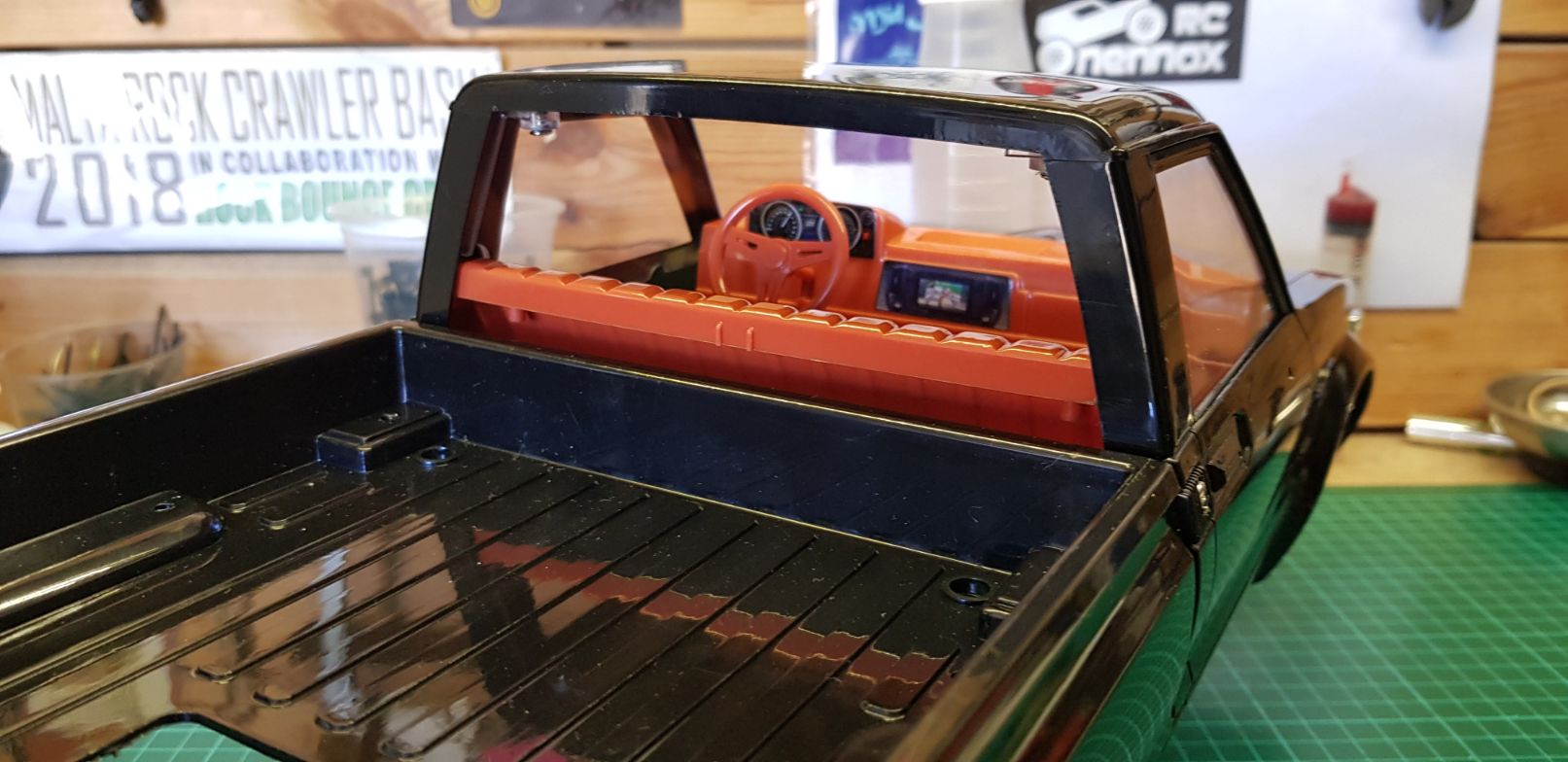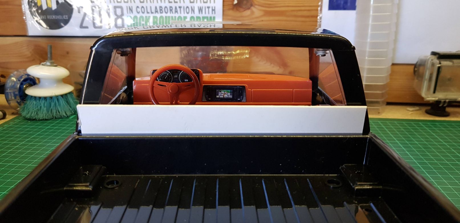 |  | Removed that bling-bling that came with it …. But ended up with a small problem.  There's no rear window.  It's easy to fix, transparent plastic and done, but I want to raise the lower part of the body behind the seat.  I'm told there's a part from RC4WD that does the job I want, but I want to try to solve this myself. If I fail, then I'll get the part. |  |