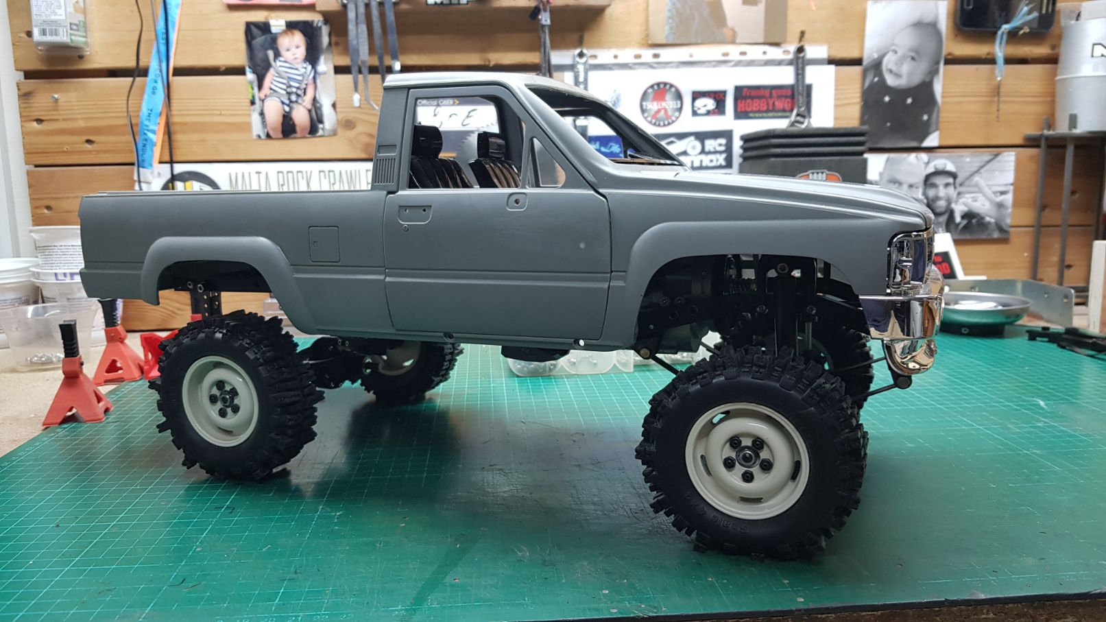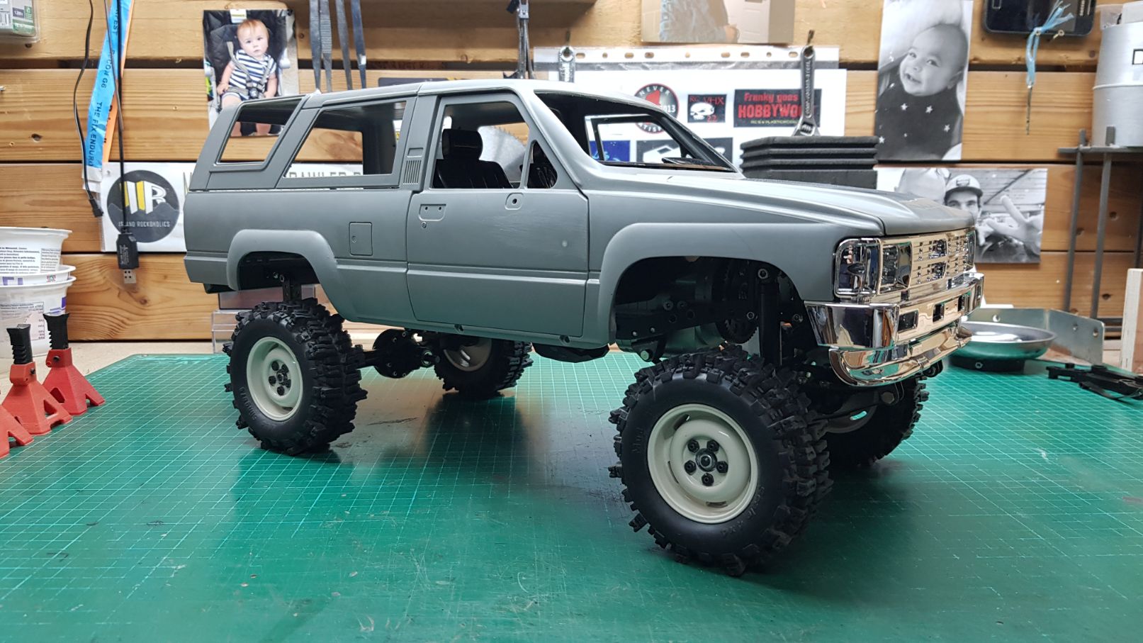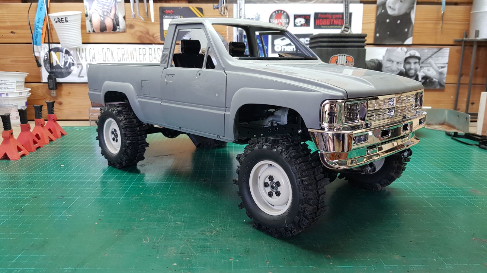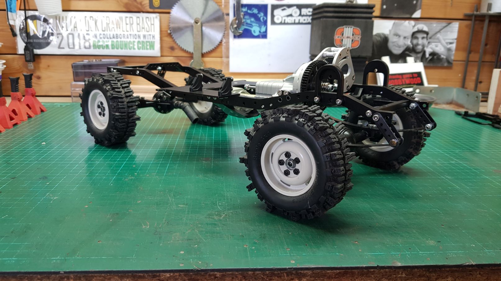 | Later on in the afternoon, I removed the set of Yota 2 axles from a static car I have in the garage, opened 2 new packets of leaf springs and started mounting them on the chassis. These tres and wheels are for testing purpose only.   First go I only used one leaf on each wheel. It was too soft especially when I will eventually add the weight of the ESC, remote light switch, lights, receiver and lipo.   So I added all 4 leafs and WOW - look how high the ride is .. Not exactly the look I am looking for but...... we shall see..   The rear roof made no difference on the ride height..   I think I need to start on the body mounts before I consider ride height. Need to know where the body will sit and hopefully stay there. Then would be a good time to talk ride height     |
