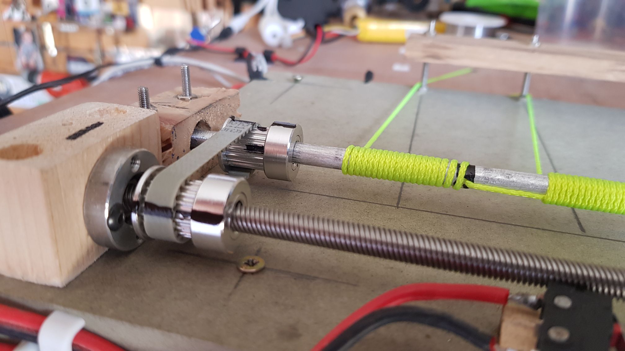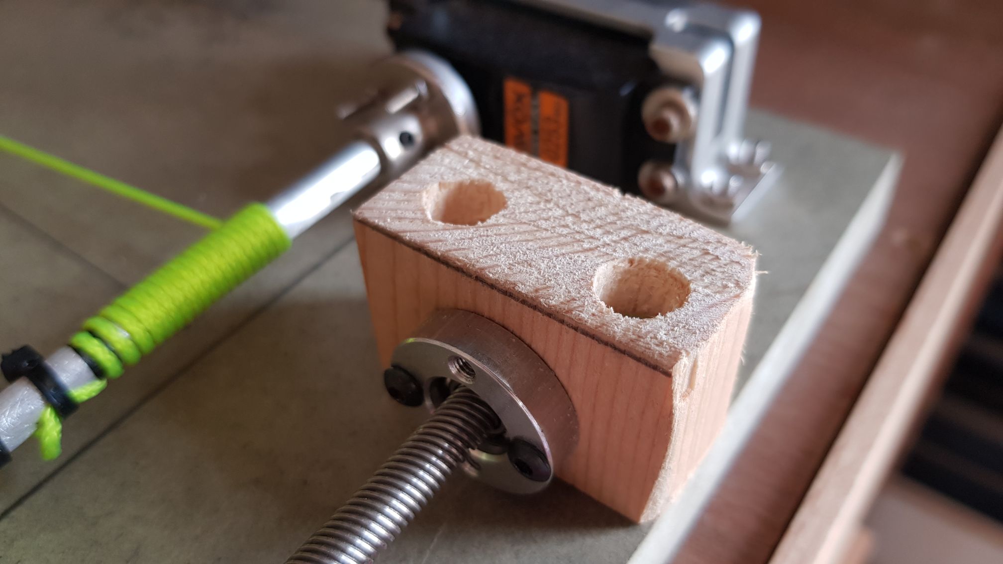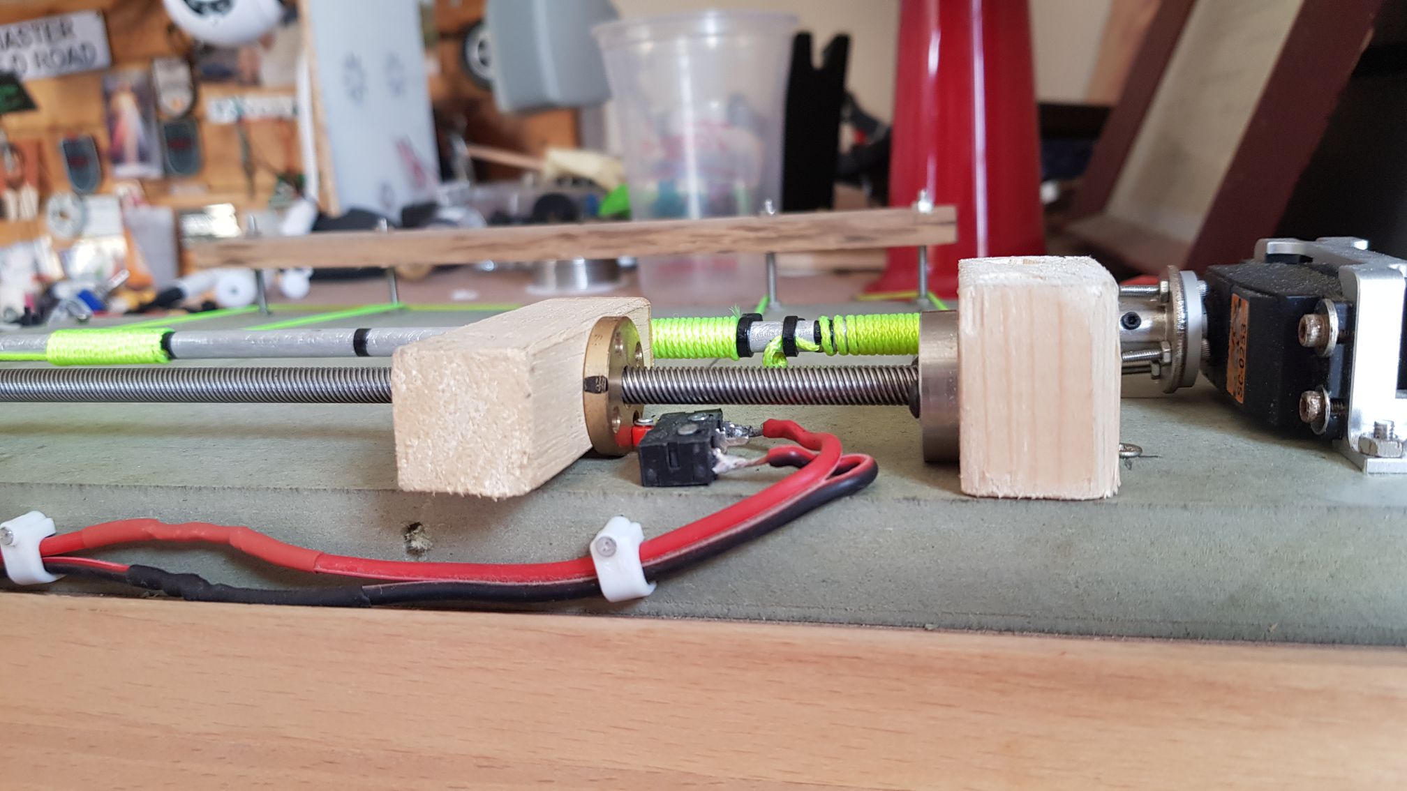 | Made some changes to the way the limit switches were activated. The next two images are my homemade bearing carriers as the I ordered the wrong size.     This block of wood moves up and down along the threaded rod until it reaches and activates the limit switches along its path.   Removed the old top around the main shaft method and am now using the gears and belt method to enhance the accuracy of the block movement.   Replaced the old fishing line with this tough string. I use this string for all my winches.  Holes in the roof where the string enters the garage