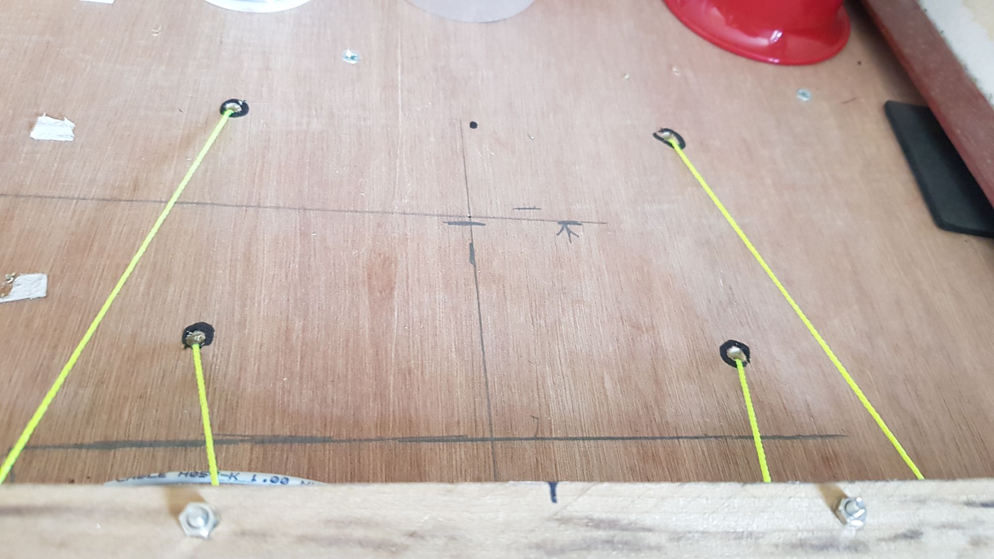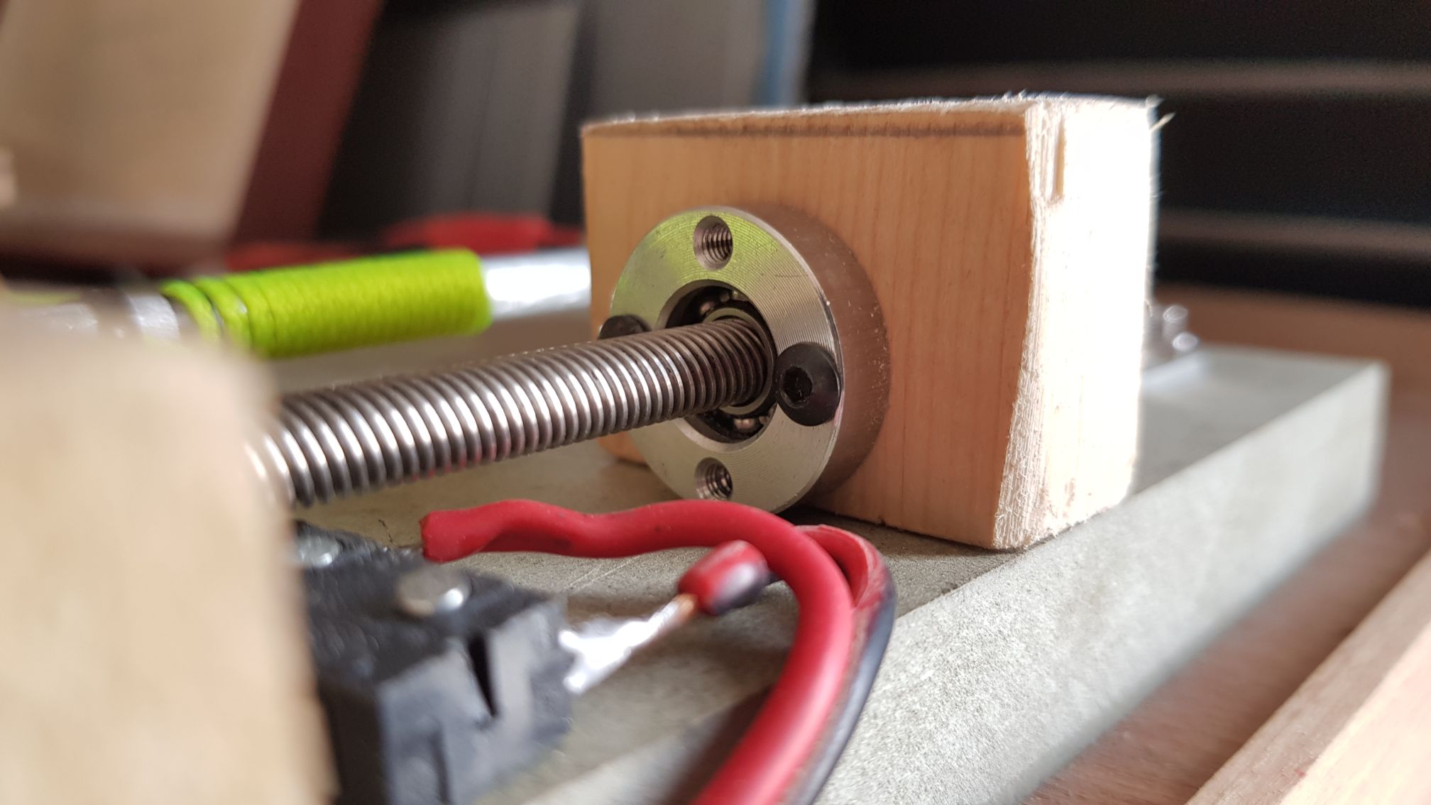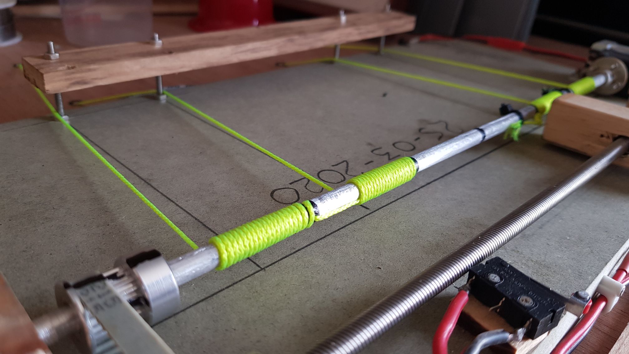 | Made some changes to the way the limit switches were activated. The next two images are my homemade bearing carriers as the I ordered the wrong size.     This block of wood moves up and down along the threaded rod until it reaches and activates the limit switches along its path.   Removed the old top around the main shaft method and am now using the gears and belt method to enhance the accuracy of the block movement.   Replaced the old fishing line with this tough string. I use this string for all my winches.  Holes in the roof where the string enters the garage