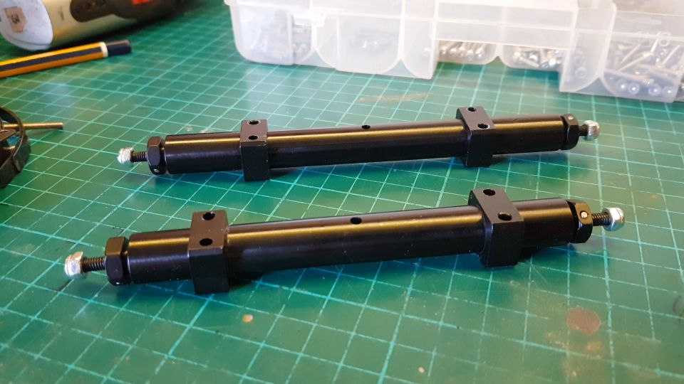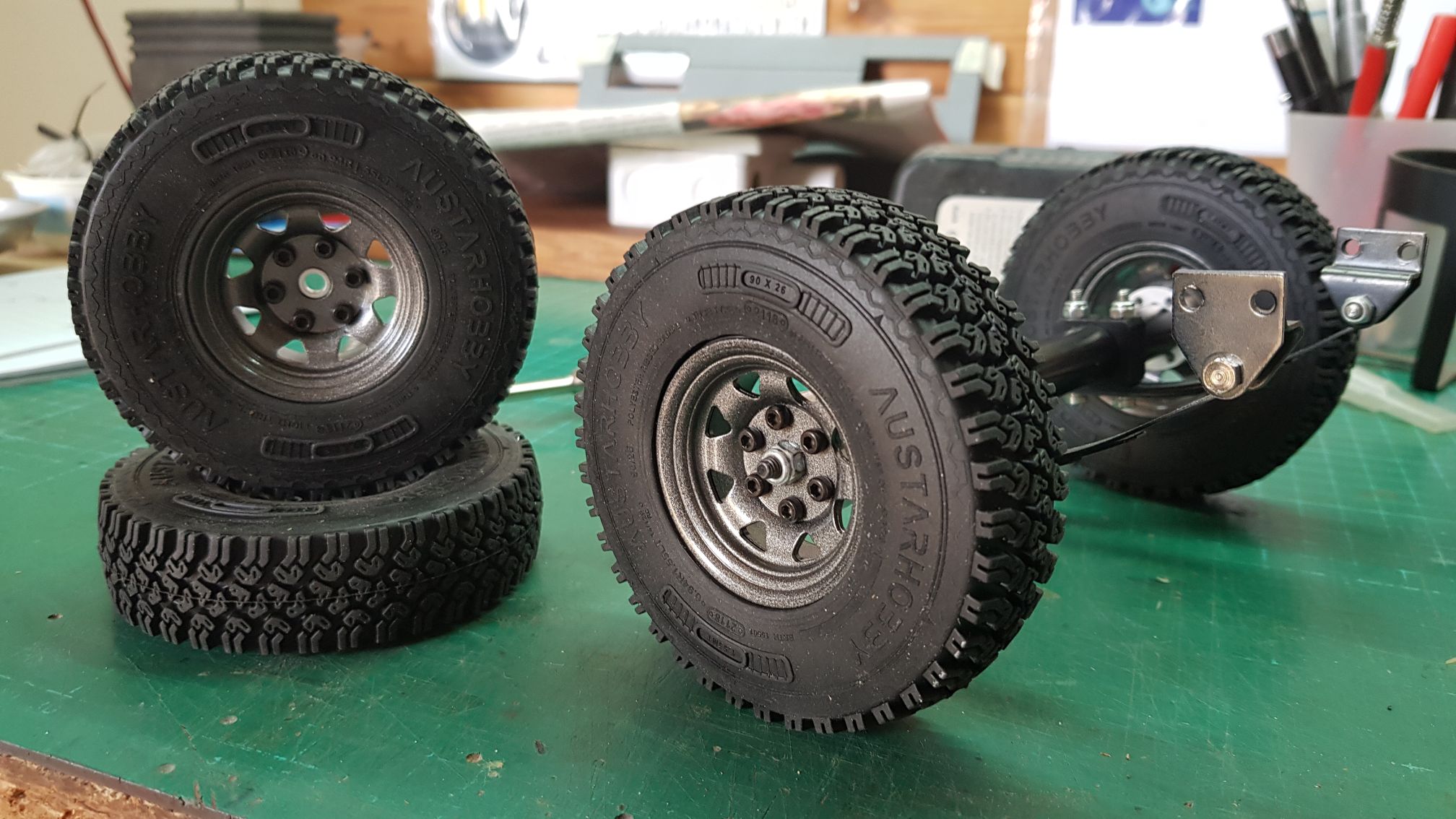 I also came across these very affordable 1.55 set of 4 Injora wheels and tyres from here. They come unassembled but once I assembled them, they soon looked as good as they looked in the image I saw when I bought them. This image shows the axles and wheels with a set of leaf springs mounted. Perfect setup for this caravan