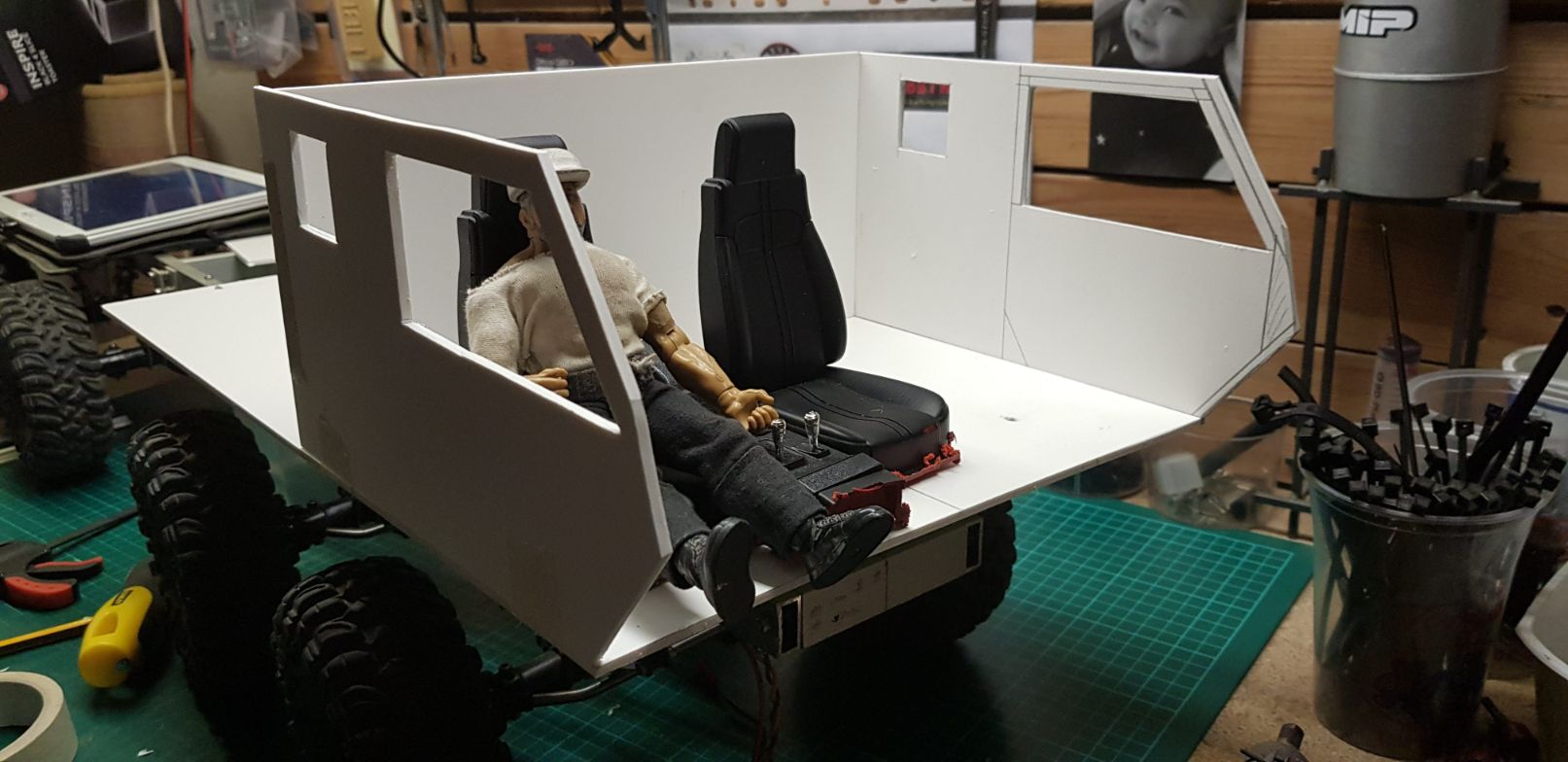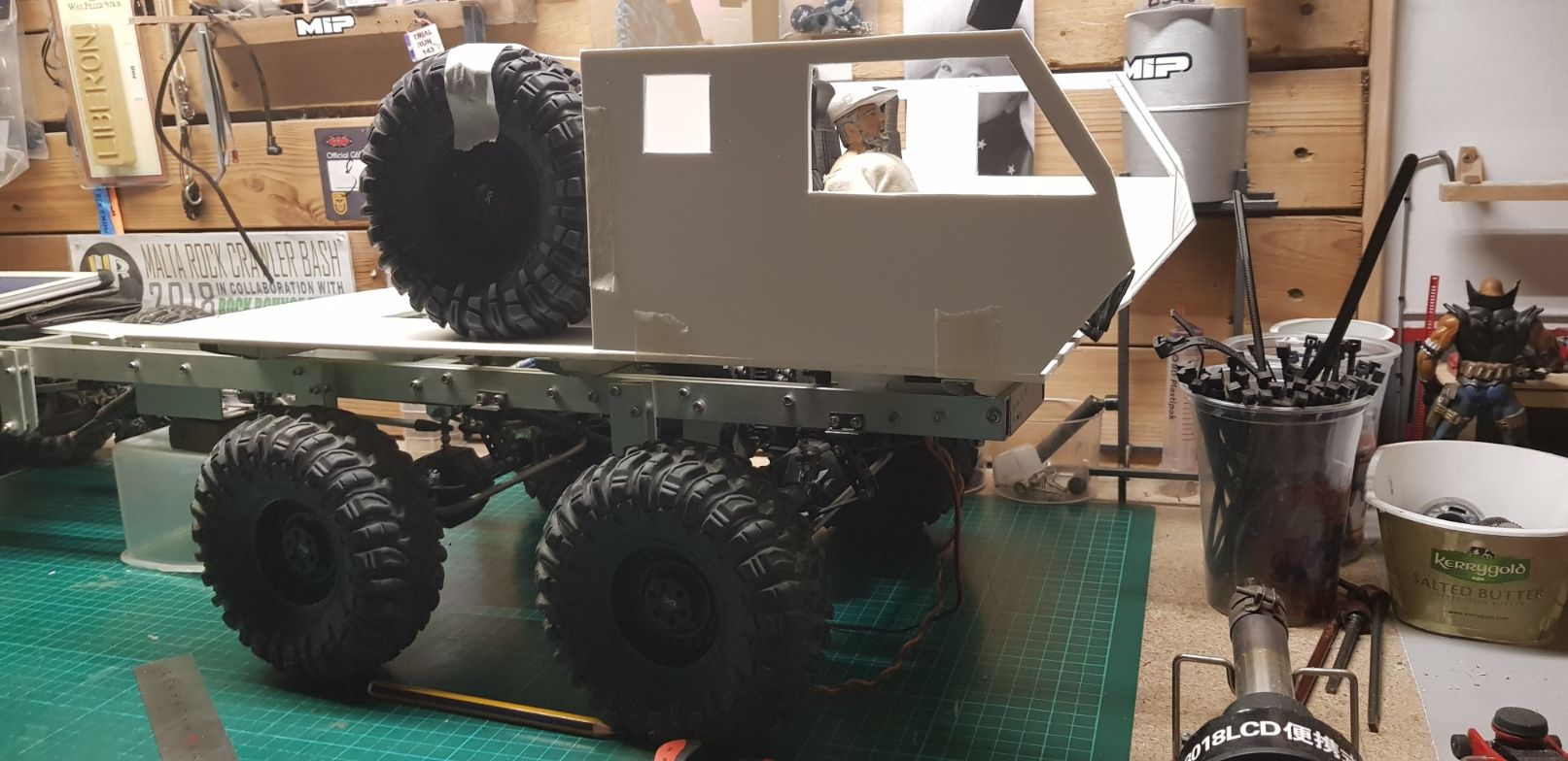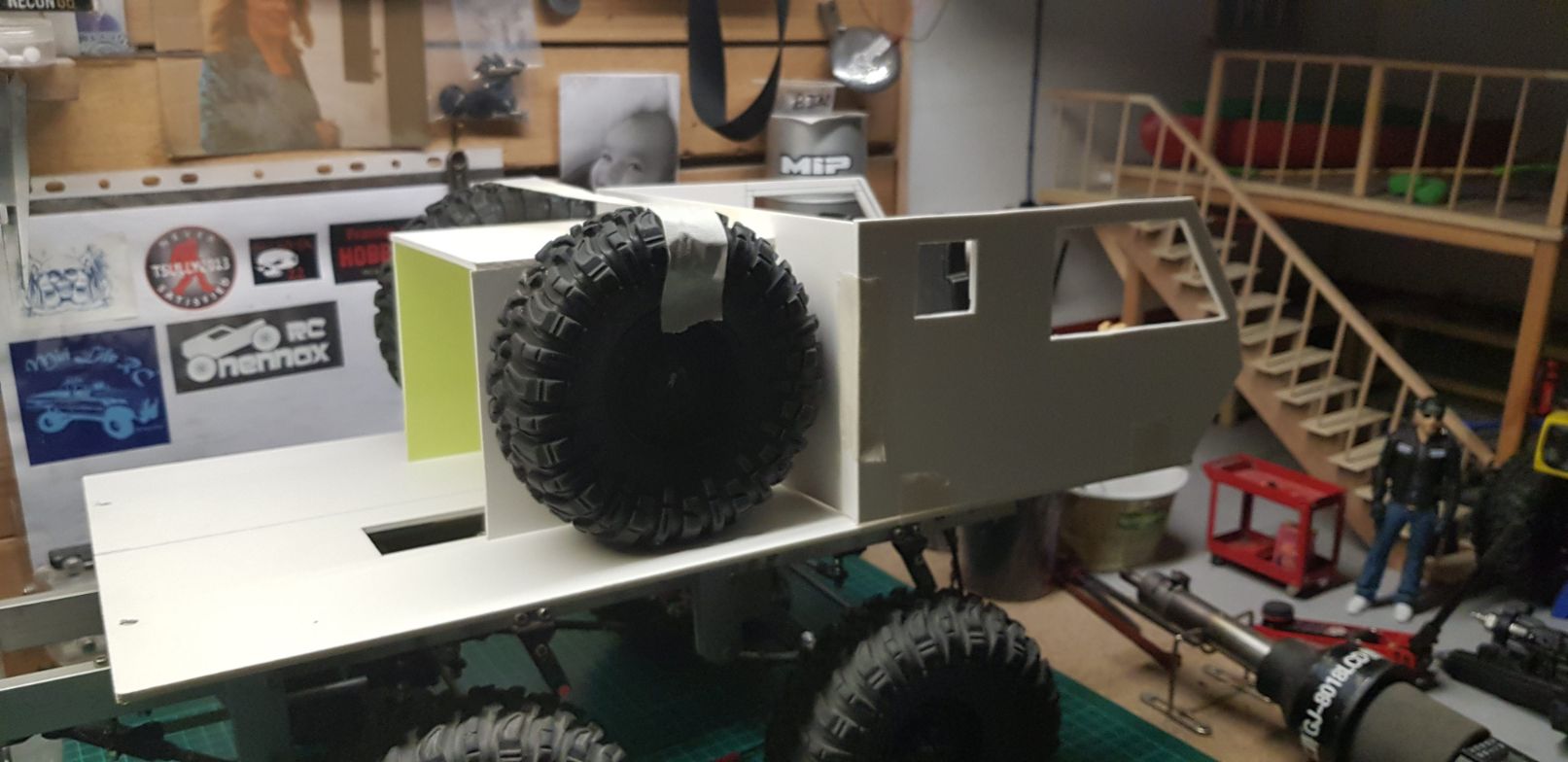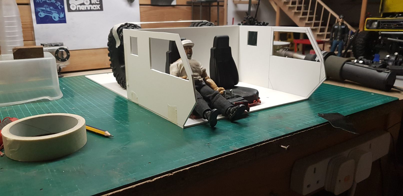 Cut both sides of the driver cab and started cutting out the windows. Note the smaller window is for the sleeper behind the drivers and passengers seats.   Dry fit the two sides and rear part of the drivers cab together with masking tape to get a feel of where this is going.   Front view   Rear/side view   Here's the engine bay with spare wheels on either side.        Before starting on the roof, I made a cardboard cutout of what it will look like. Needs a lot of tweaking and more cardboard cutouts before I make the final cut.   Happy with the progress. My first time working with styrene  Still a  long way to go.. No rush. |