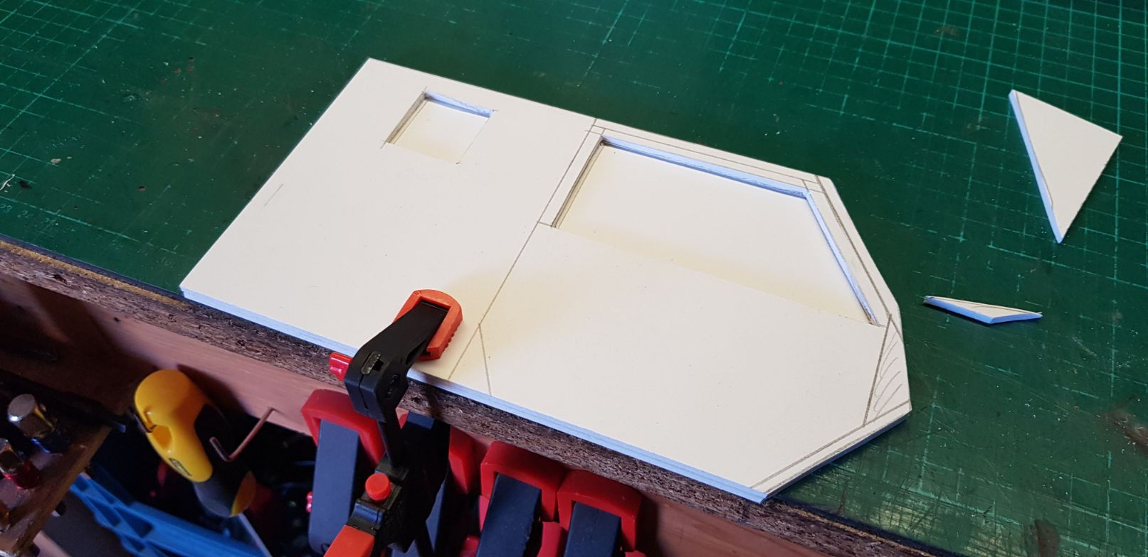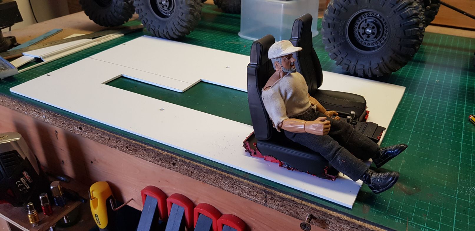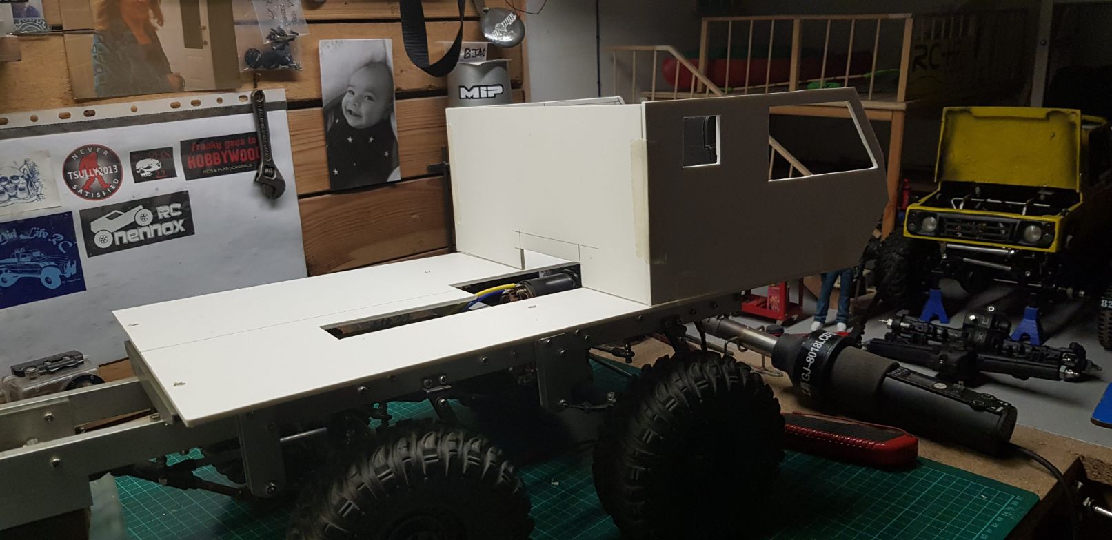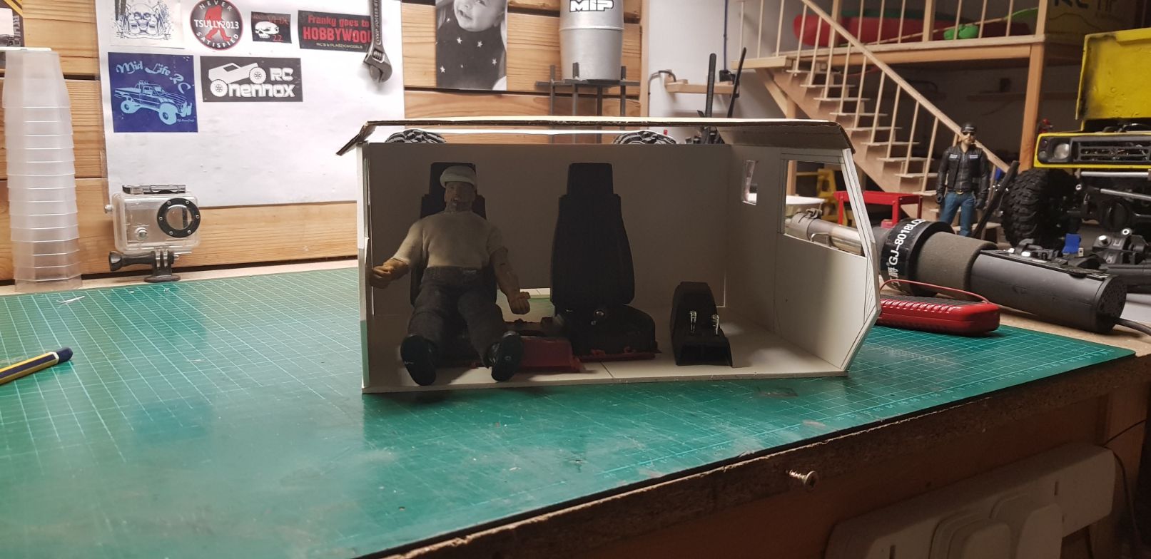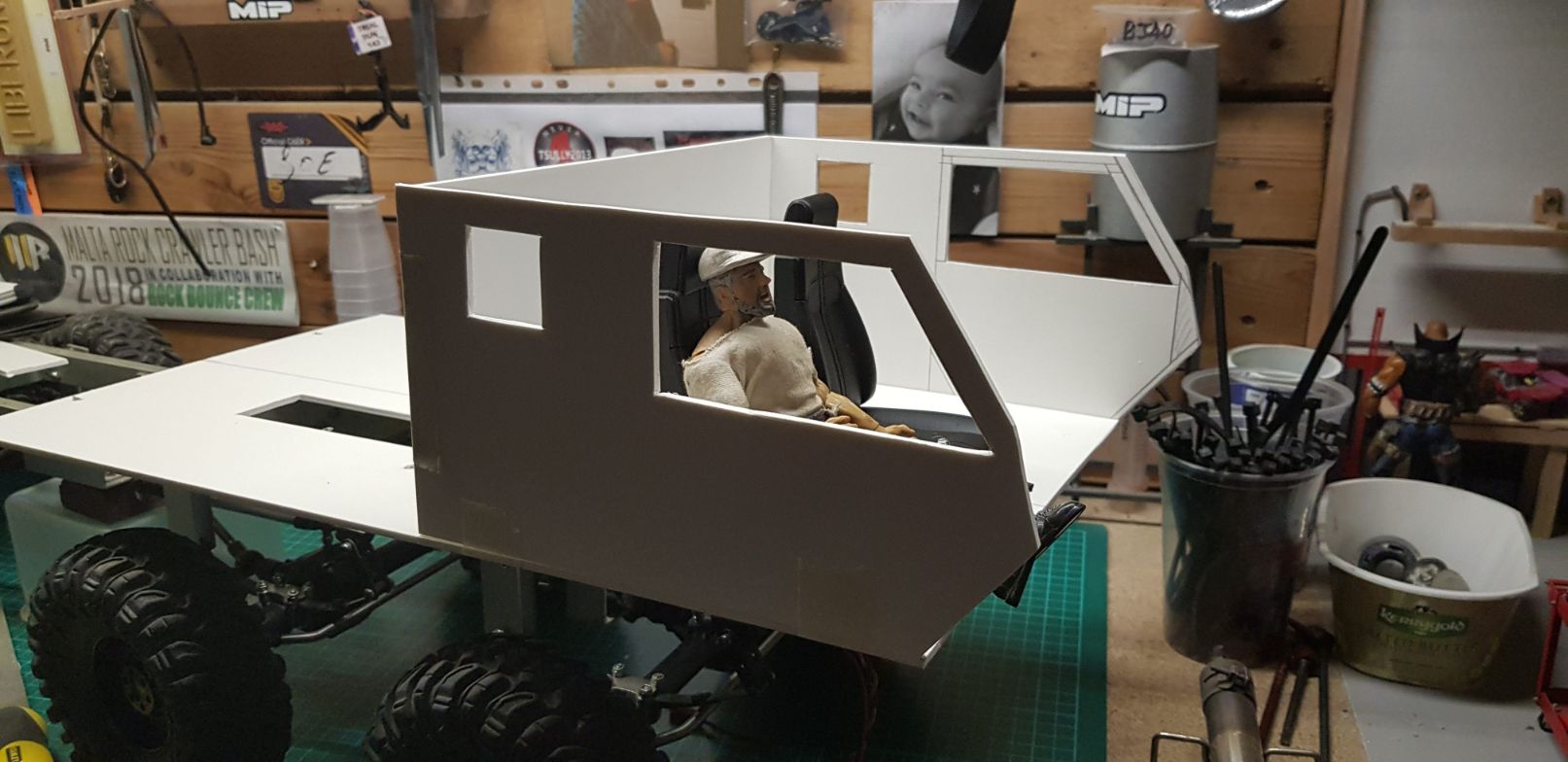 Cut both sides of the driver cab and started cutting out the windows. Note the smaller window is for the sleeper behind the drivers and passengers seats.   Dry fit the two sides and rear part of the drivers cab together with masking tape to get a feel of where this is going.   Front view   Rear/side view   Here's the engine bay with spare wheels on either side.        Before starting on the roof, I made a cardboard cutout of what it will look like. Needs a lot of tweaking and more cardboard cutouts before I make the final cut.   Happy with the progress. My first time working with styrene  Still a  long way to go.. No rush. |