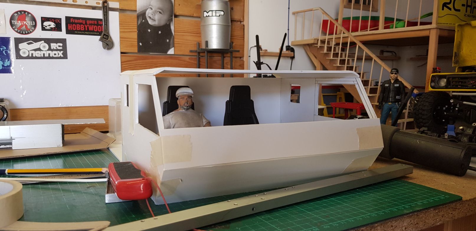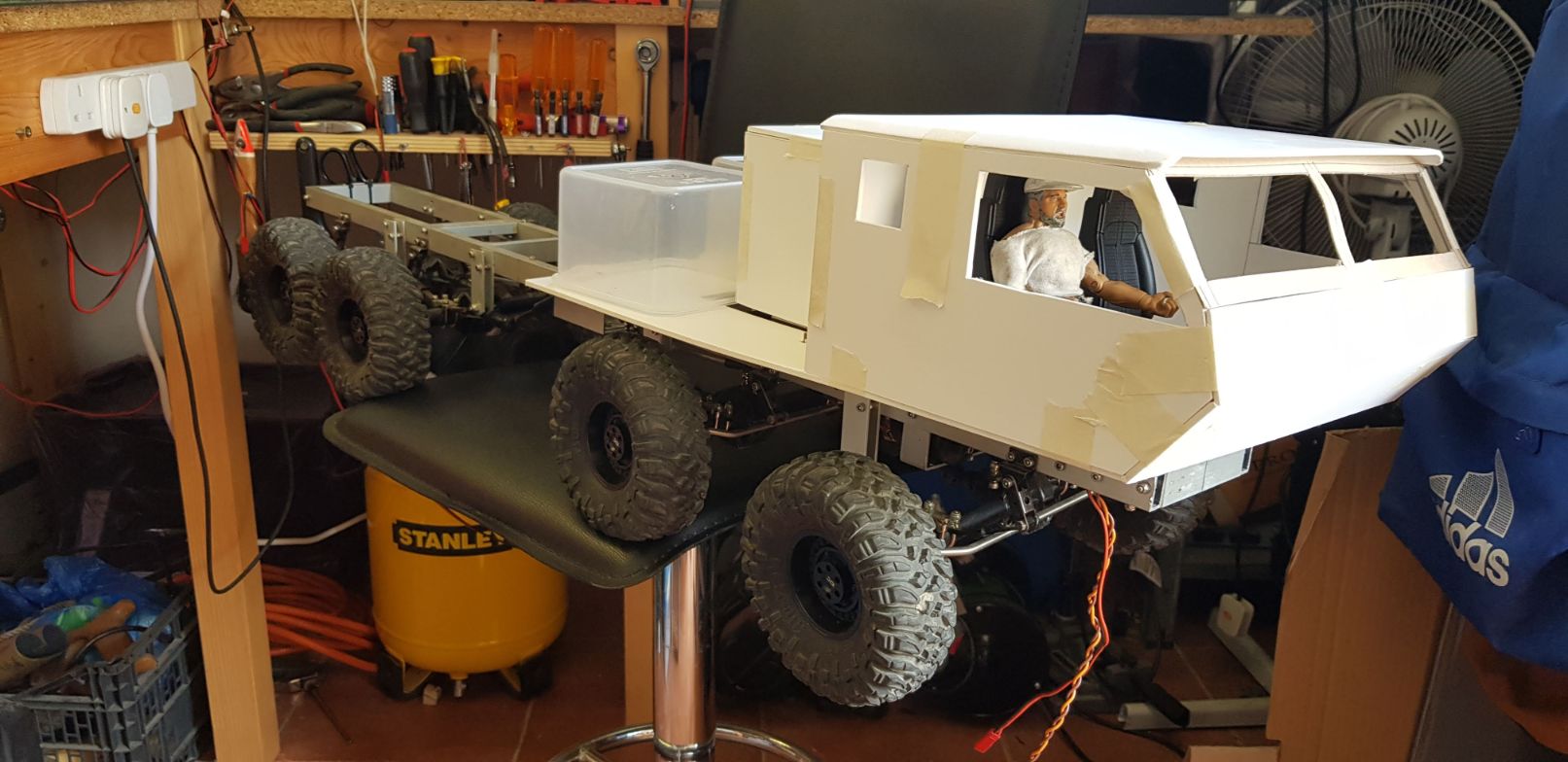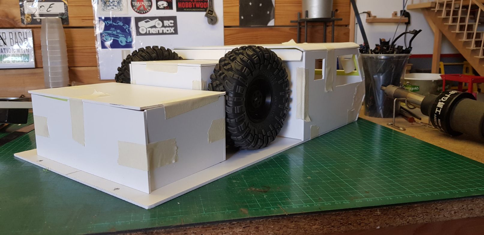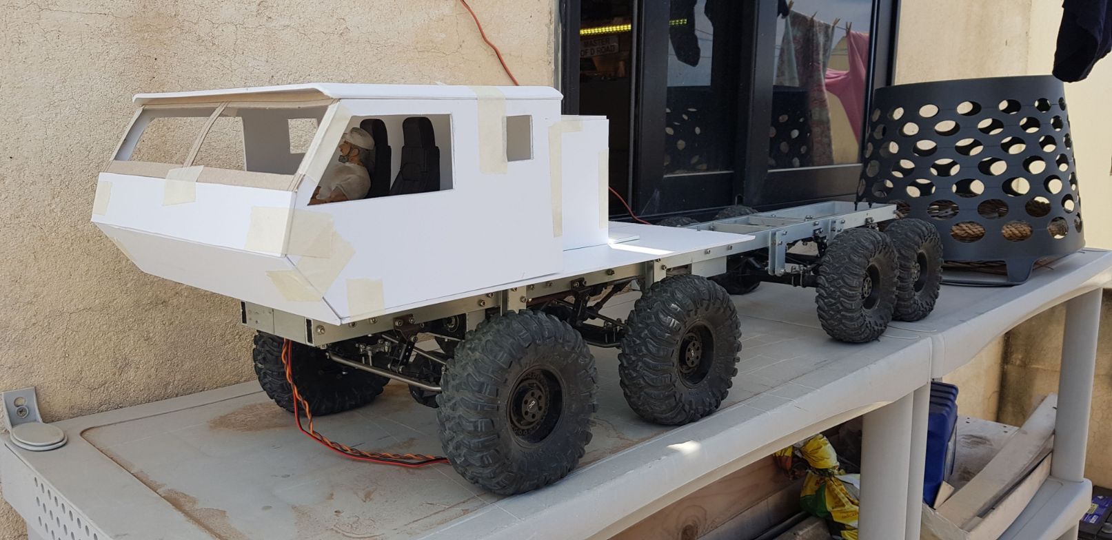 There, not too bad, but will do more refining when its time to glue it all together.   So this is the look I'm going for. Those plastic containers at the rear were for me to visualize a tool box which will be used for the lipo and electronics.   The doors will be extended below the level of the chassis rails. I opted to work like this because it is easier to work with a flat bottom when placing the body on the workbench surface.  And last, but not least, here is the "tool box/lipo and electronics box"   The next step will be to start gluing it all together and sanding down the rough edges for a cleaner fit. After that, the wheel arches and lower part of the doors. |