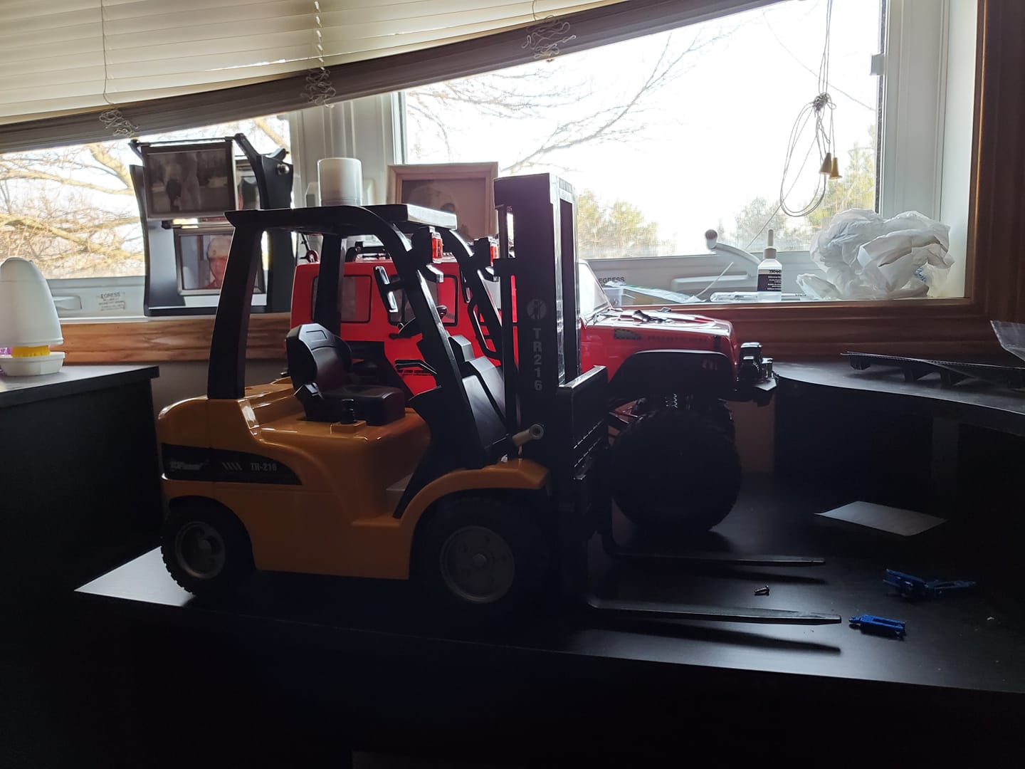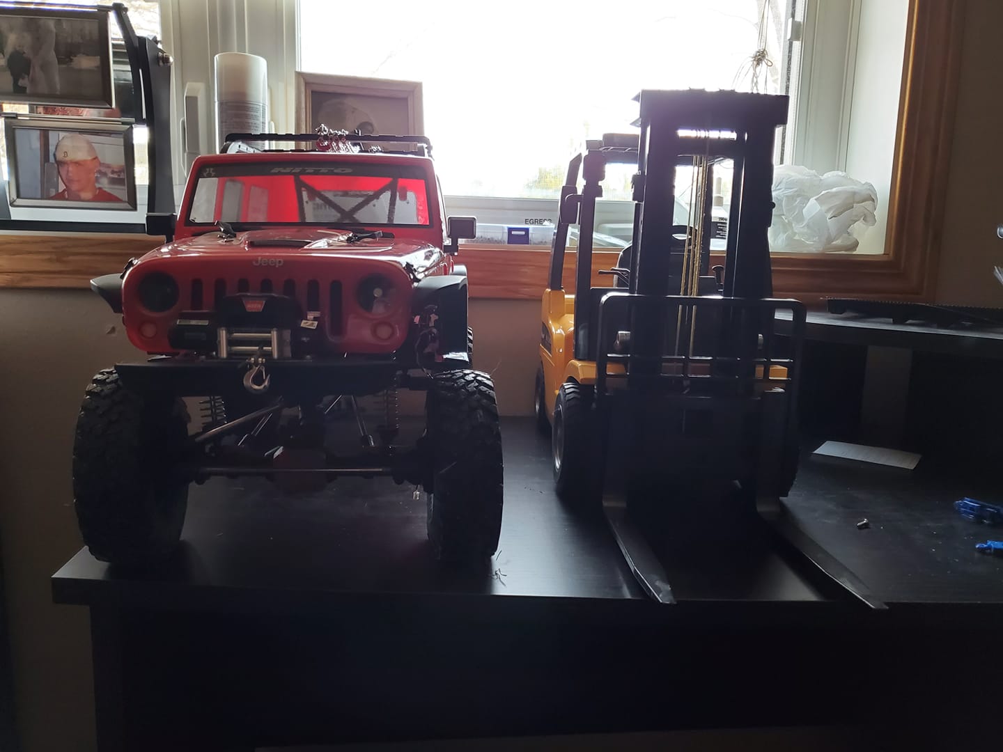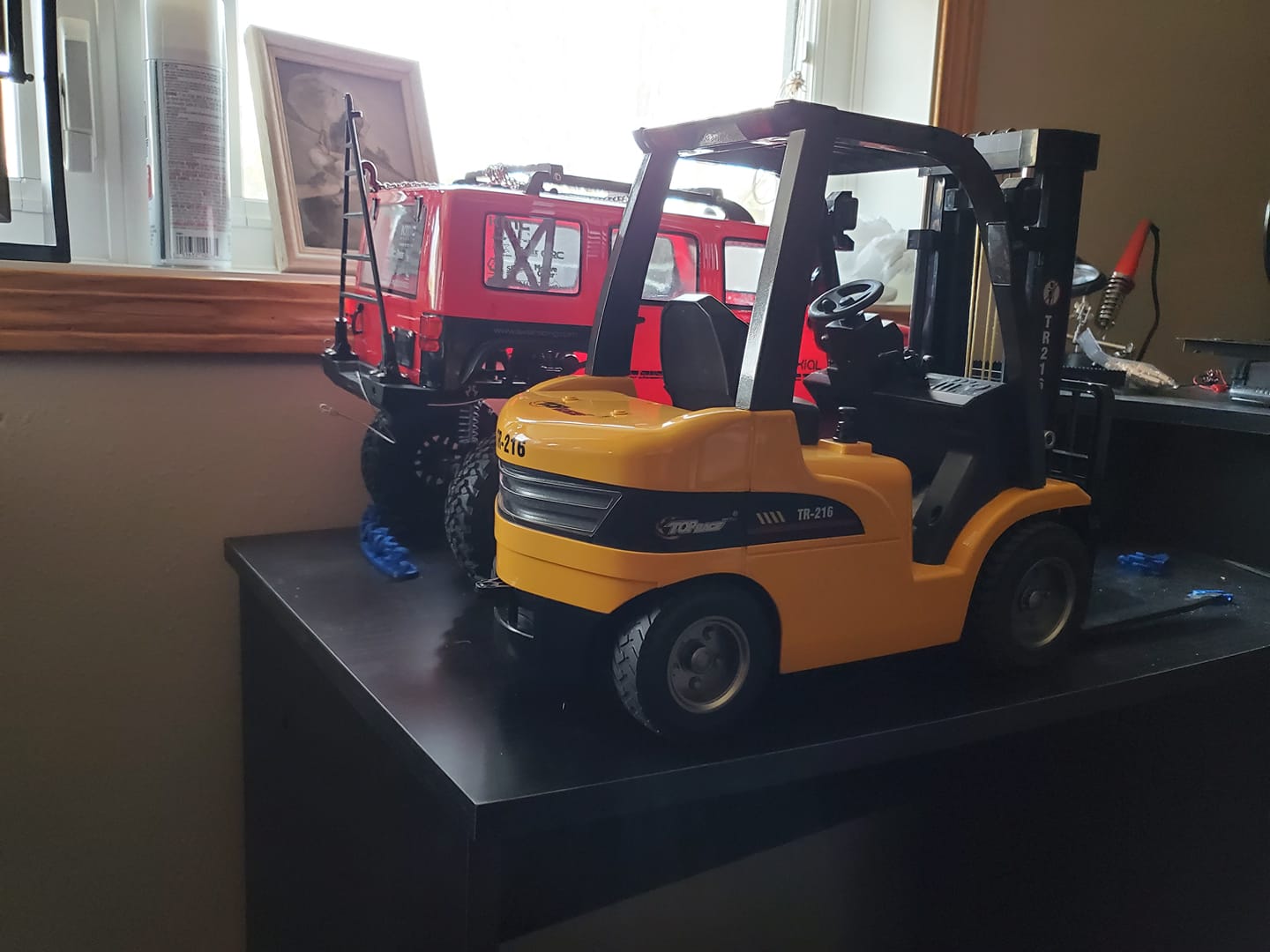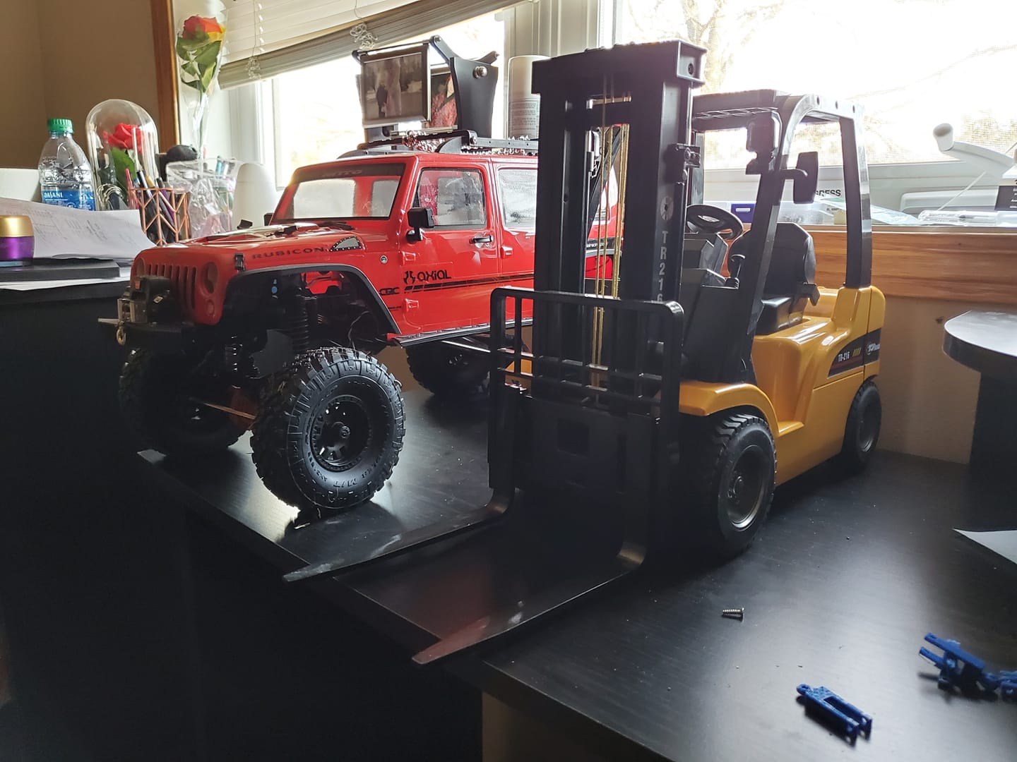 |  | These pictures (courtesy of Josh Gangestad) show the size comparison of the HUINA 1577 2-In-1 RC Forklift with a trail truck         The forklift is as suspected, that is, a bit on the large side,  that said, because of the lack of the correct size for my personal use I would choose between this one and the 1:14 Linde Forklift 2.4G 100% RTR above. I am not saying either or both are the correct size, but they are both the lesser of two evils in this particular case. The search continues.. |  |